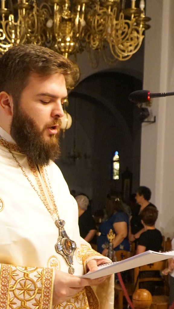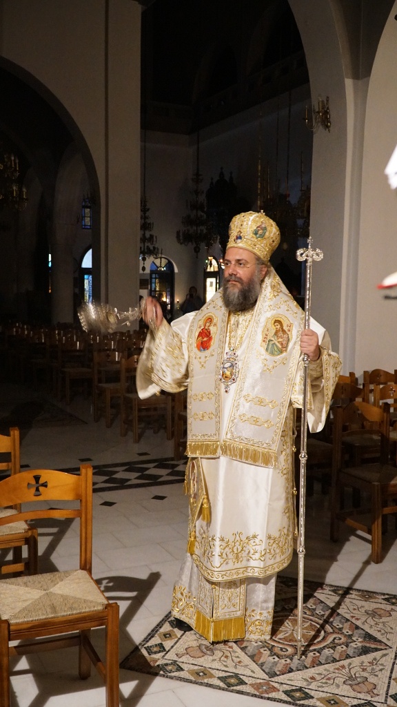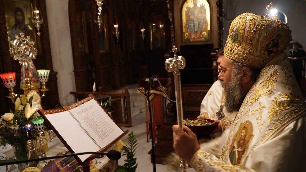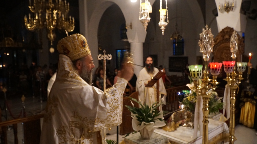 Κατά την Ιερά Αγρυπνία Χοροστάτησε κατά την Ακολουθία του Όρθρου ο Σεπτός μας Ποιμενάρχης κ. Χρυσόστομος και πριν την έναρξη της Θείας Λειτουργίας ηγήθηκε εντός του Ναού της λιτανεύσεως του Επιταφίου του Θεομητορικού σώματος και εν συνεχεία εψάλλησαν τα Εγκώμια προς την Παναγία.
