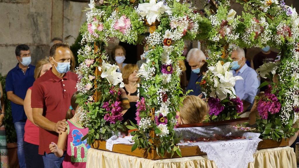 Μετά το πέρας του Εσπερινού ενώπιον του Επιταφίου του Θεομητορικού σώματος εψάλλησαν τα Εγκώμια της Θεοτόκου.