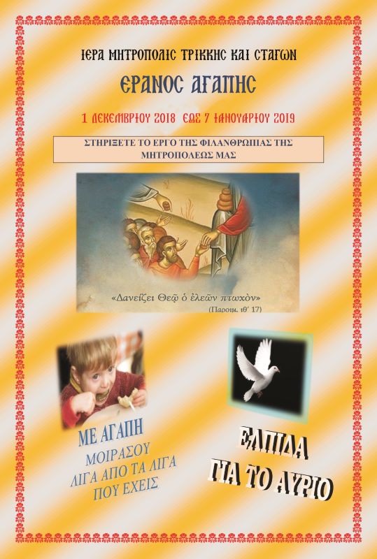 Από 1 Δεκεμβρίου 2018 έως 7 Ιανουαρίου 2019, που πραγματοποιείται στα όρια της κάθε ενορίας ο Έρανος της Αγάπης, με σκοπό να συγκεντρωθούν χρήματα για την ενίσχυση της όλης προσπάθειας για τη στήριξη των ενδεών αδελφών εκάστης ενορίας, μην κρατήσετε την πόρτα σας κλειστή!